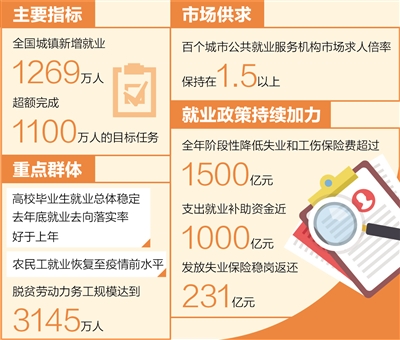 看主要指標(biāo),全國城鎮(zhèn)新增就業(yè)1269萬人,超額完成1100萬人的目標(biāo)任務(wù);全年全國城鎮(zhèn)調(diào)查失業(yè)率平均值為5.1%,比上年平均值下降0.5個(gè)百分點(diǎn),就業(yè)目標(biāo)任務(wù)圓滿完成。