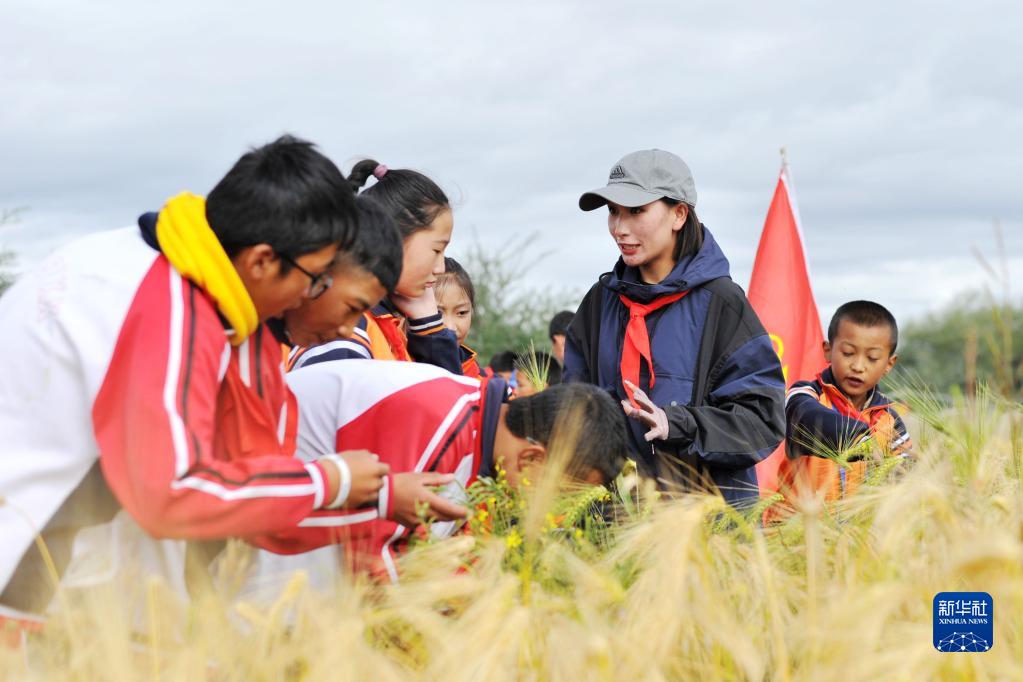 日喀則市上海實(shí)驗(yàn)學(xué)校德育副校長(zhǎng)潘杰和學(xué)生在青稞地里交流(9月17日攝)。新華社發(fā)(施剛強(qiáng) 攝)