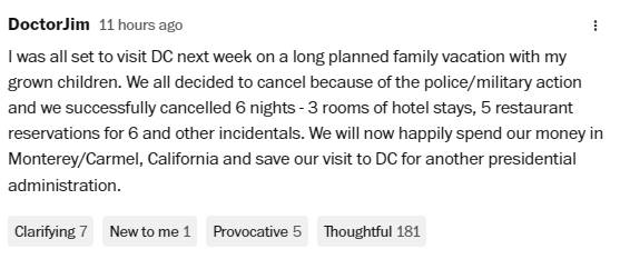 一位網友寫道,他因為軍警管制而取消了去首都的旅程,原本他和家人打算在華盛頓特區(qū)住6晚,在旅館定了3間房,在餐廳提前定了5頓6人餐,但這些消費都被取消了。