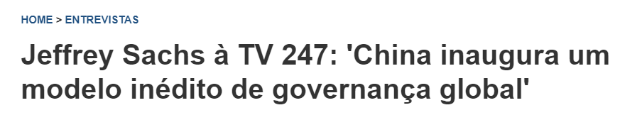 巴西247新聞網(wǎng)近日刊登一篇文章,介紹了世界知名學(xué)者杰弗里·薩克斯接受巴西247電視臺(tái)專訪時(shí),對(duì)中國(guó)提出的全球治理倡議予以高度評(píng)價(jià)。他認(rèn)為,“中國(guó)開創(chuàng)了前所未有的全球治理模式”。