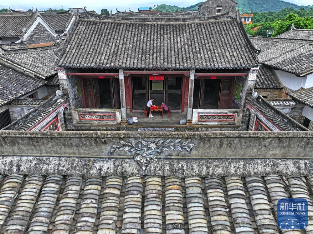 8月15日,楹聯(lián)愛好者在大蘆村古宅里寫對(duì)聯(lián)(無(wú)人機(jī)照片)。