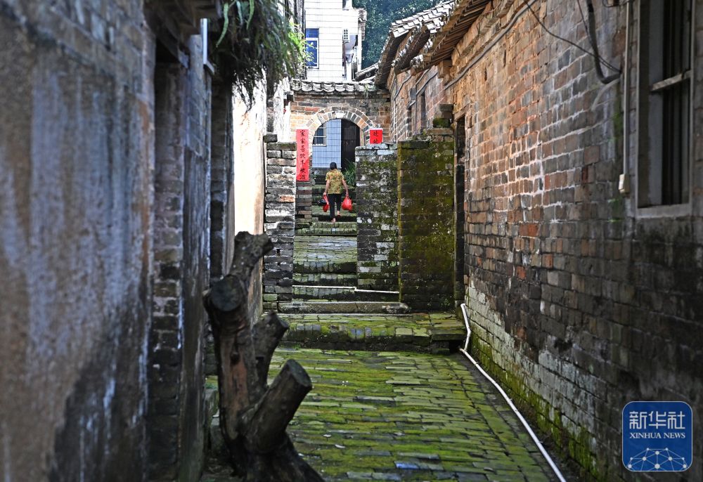 8月16日,一名村民在大蘆村一條小巷里穿行。