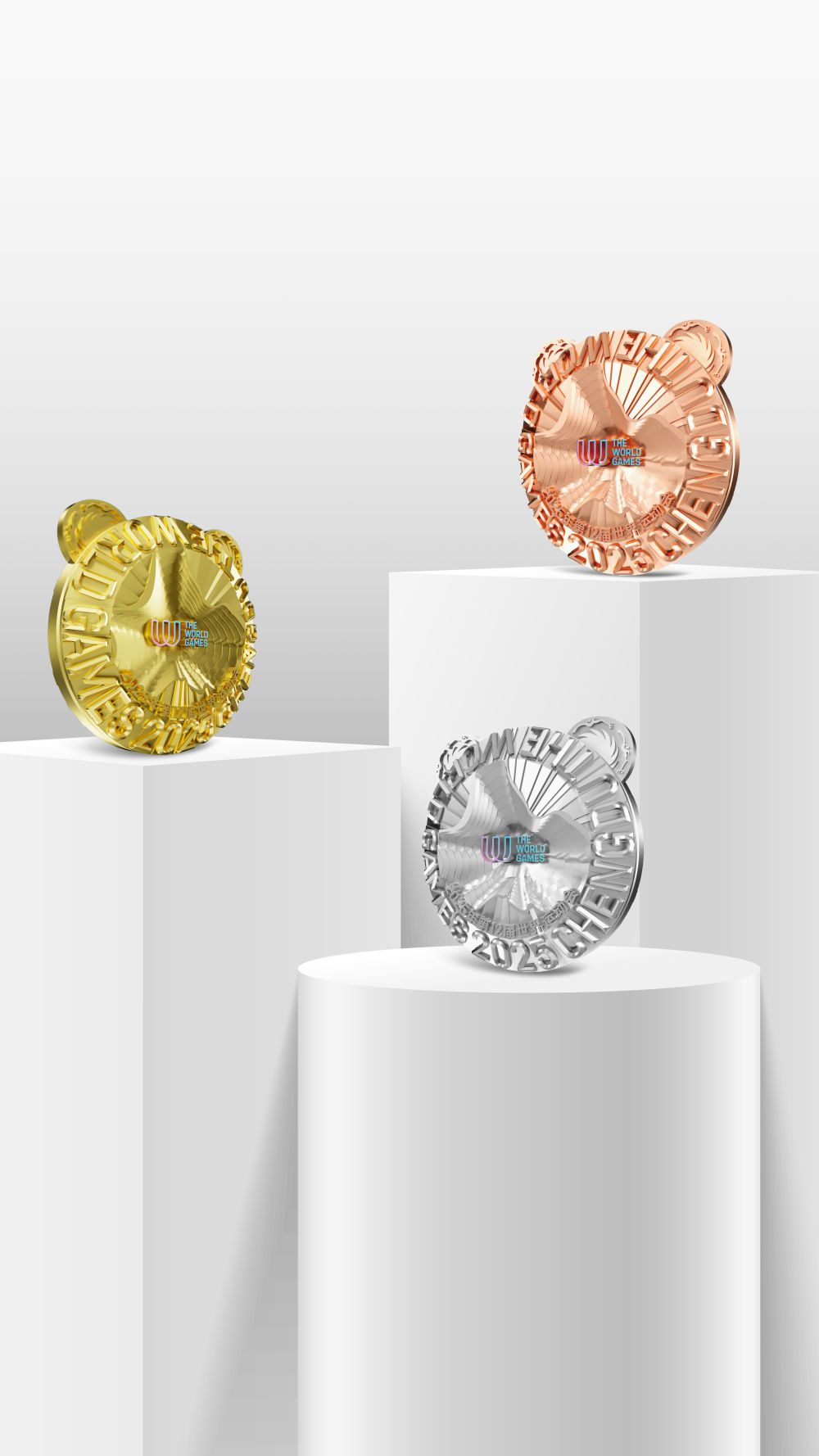 “竹光”獎牌正面居中的是國際世界運(yùn)動會協(xié)會會徽,賽事中英文名稱環(huán)繞呼應(yīng)。巧妙融入的太陽神鳥紋飾,與暗合城市輪廓的流動凹凸線條,在底部營造出層層光芒,既彰顯中華文明、巴蜀文化的璀璨歷史,更象征著運(yùn)動精神永恒閃耀。