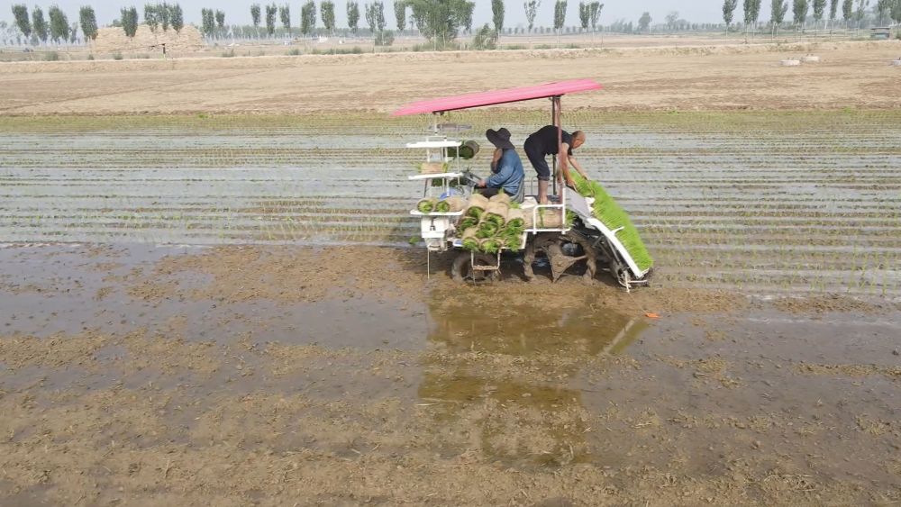 在河南省新鄉(xiāng)市原陽(yáng)縣太平鎮(zhèn),種植戶(hù)們?cè)诓逖頇C(jī)的助力下,搶抓農(nóng)時(shí),進(jìn)行水稻插秧。受訪者供圖