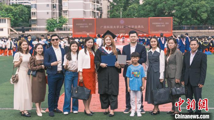 在廣西科技大學(xué)27日舉行的畢業(yè)典禮上,老撾留學(xué)生馬麗文成為全場(chǎng)焦點(diǎn):她的父母、兄弟等十位親人跨國(guó)而來,見證這一重要時(shí)刻?!爱?dāng)家人手捧鮮花向我走來,我緊緊擁抱住他們,感謝他們支持我的夢(mèng)想?!瘪R麗文說。