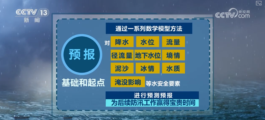預報是基礎和起點,通過一系列數學模型方法,對降水、水位、流量、徑流量、地下水位、墑情、泥沙、冰情、水質、淹沒影響等水安全要素進行預測預報,為后續(xù)防汛工作贏得寶貴時間。