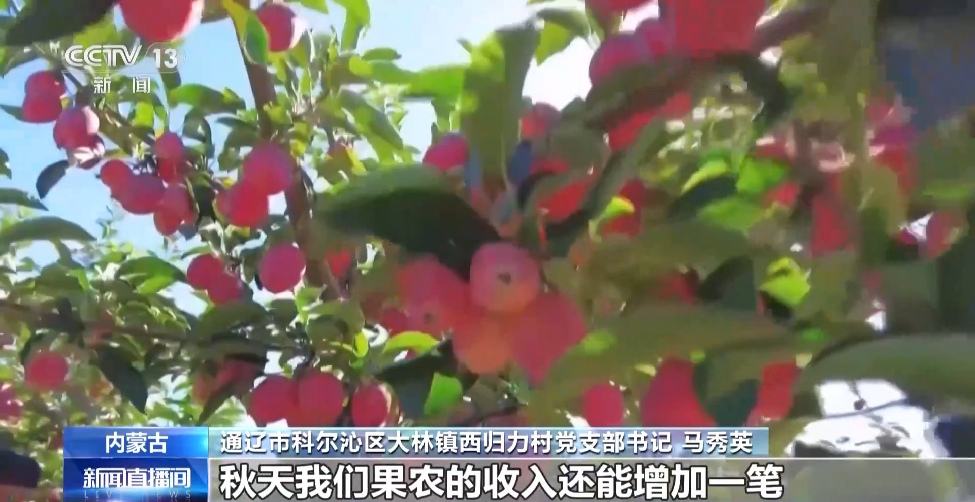 通遼市科爾沁區(qū)大林鎮(zhèn)西歸力村黨支部書記 馬秀英:今年的果長得特別好,我們引進了深加工,秋天我們果農的收入還能增加一筆。