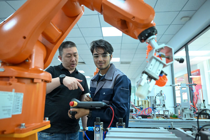 在天津現(xiàn)代職業(yè)技術學院魯班工坊實訓教室,教師指導學生操作設備(2025年6月16日攝)。
