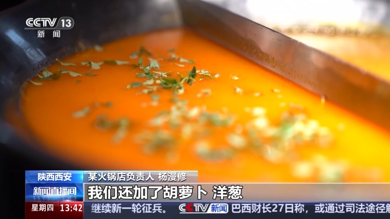 某火鍋店負(fù)責(zé)人 楊漫修:我們這個(gè)番茄鍋更像是西餐里面的番茄濃湯,比如說(shuō)我們?cè)谧隽系臅r(shí)候除了番茄以外,我們還加了胡蘿卜、洋蔥、歐芹、百里香。