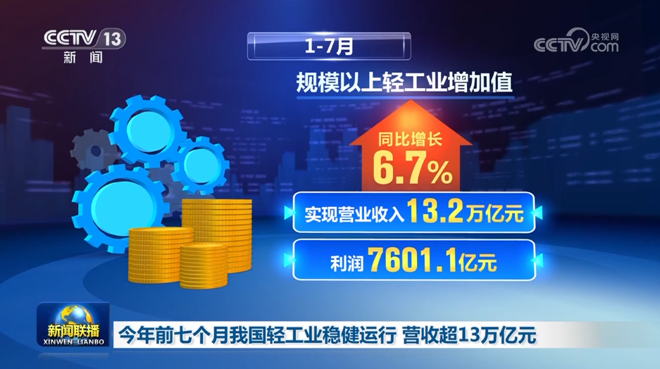 中國輕工業(yè)聯(lián)合會數(shù)據(jù)顯示,今年前七個(gè)月,在擴(kuò)內(nèi)需、促消費(fèi)政策支持下,我國輕工業(yè)運(yùn)行穩(wěn)健,生產(chǎn)、營收、市場規(guī)模均保持良好態(tài)勢。規(guī)模以上輕工業(yè)增加值同比增長6.7%,實(shí)現(xiàn)營業(yè)收入13.2萬億元、利潤7601.1億元。