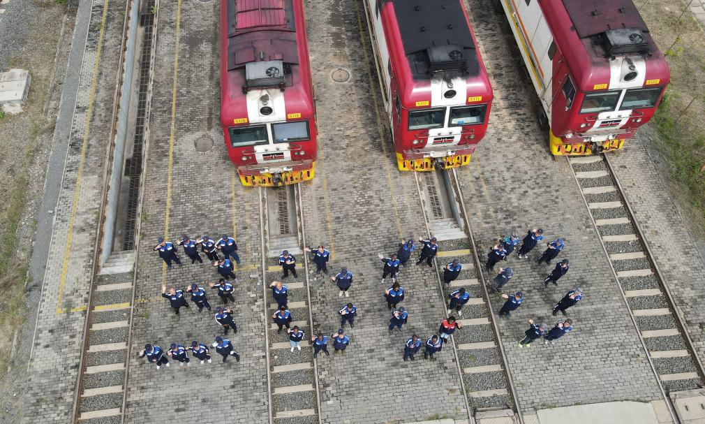 2025年8月19日,在肯尼亞內(nèi)羅畢非洲之星鐵路運(yùn)營有限責(zé)任公司機(jī)務(wù)運(yùn)轉(zhuǎn)整備場,中肯兩國鐵路工作者在機(jī)車前站列并組成“3000”字樣,以紀(jì)念蒙內(nèi)鐵路實(shí)現(xiàn)安全運(yùn)營3000天(無人機(jī)照片)。新華社記者 楊光 攝