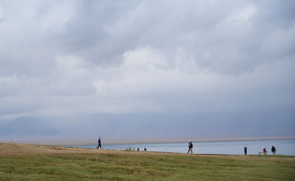 ↑ 游客在賽里木湖畔游玩(7月8日攝)。