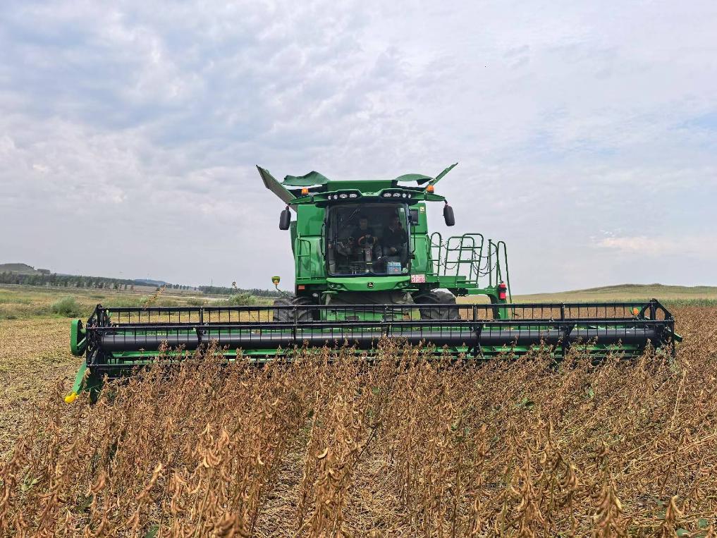 在黑龍江省七臺(tái)河市勃利縣恒山玉米專業(yè)合作社的一處地塊,一臺(tái)臺(tái)大型收割機(jī)往來(lái)穿梭,一排排飽滿的大豆植株被精準(zhǔn)卷入機(jī)身,金黃的豆粒隨即通過(guò)出糧口涌入運(yùn)糧車。