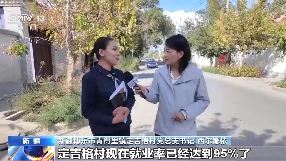 新疆博樂市青得里鎮(zhèn)定吉格村黨總支書記 西爾娜依:定吉格村現(xiàn)在就業(yè)率已經(jīng)達到95%了,相當(dāng)于每個人都有活干,每個人都有錢掙。