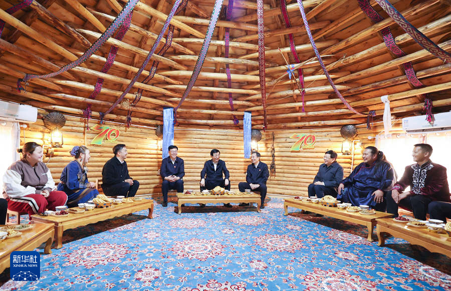 9月27日,受習(xí)近平總書記囑托,中共中央政治局常委、全國(guó)政協(xié)主席、中央代表團(tuán)團(tuán)長(zhǎng)王滬寧帶領(lǐng)中央代表團(tuán)部分成員到阿勒泰地區(qū)布爾津縣考察。這是王滬寧和中央代表團(tuán)部分成員在扎拉特鄉(xiāng)村旅游專業(yè)合作社同村民交流。新華社記者 姚大偉 攝