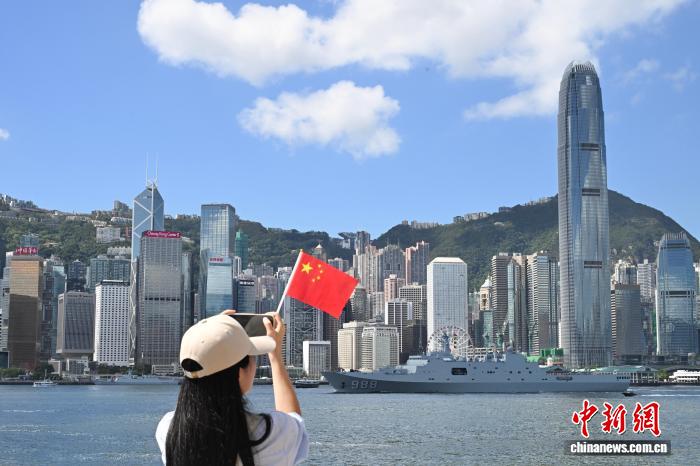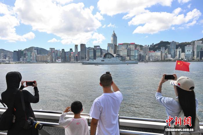 10月3日,海軍戚繼光艦、沂蒙山艦編隊完成出航前的各項準(zhǔn)備工作,駛離香港海域,前往柬埔寨、泰國、新加坡三國。尖沙咀碼頭有民眾送別海軍戚繼光艦、沂蒙山艦編隊。圖為民眾在尖沙咀碼頭拍攝海軍沂蒙山艦。 中新社記者 李志華 攝