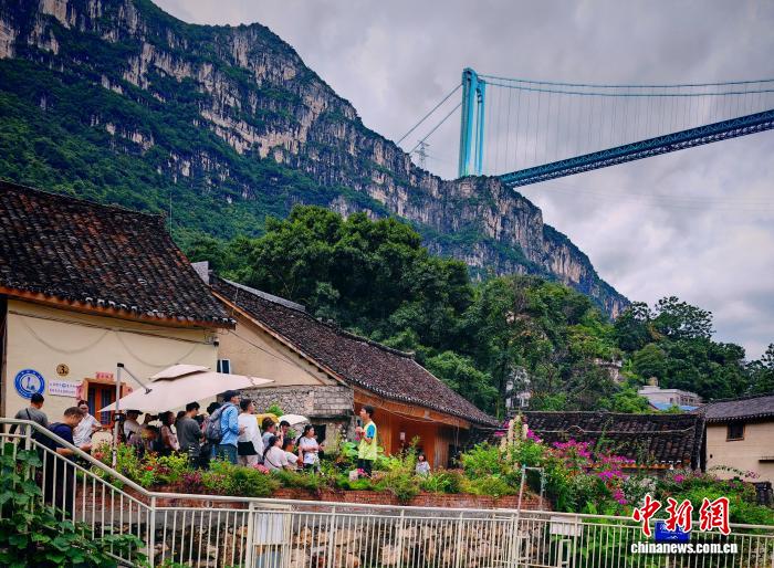 在花江村,記者看到不少游客悠閑地坐在青瓦灰墻的布依族傳統(tǒng)民居前品茶觀橋,或在村口的路邊尋找最佳角度,留下“與大橋同框”的紀念照;更有游客信步走向村邊的花江鐵索橋,尋找角度拍攝這座曾是黔滇往來要道的古橋,與遠處現(xiàn)代工程的杰作形成“新老同框”的獨特畫面。