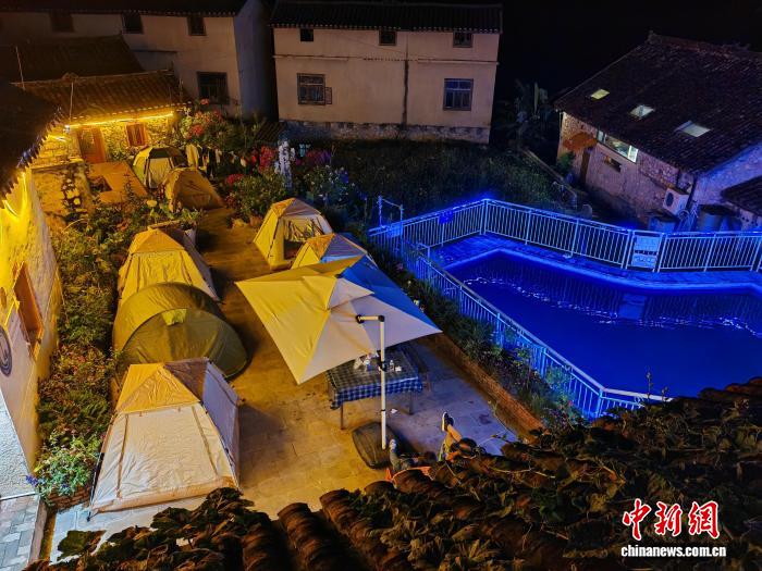 10月3日,游客在貴州省貞豐縣平街鄉(xiāng)花江村村民林國權的民宿院子內搭帳篷。(受訪者供圖)