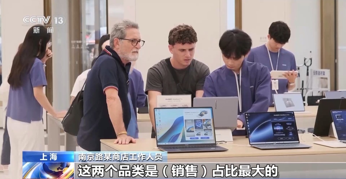 南京路某商店工作人員:外國(guó)顧客特別喜歡音頻類和智能手表類產(chǎn)品,這兩個(gè)品類是銷售占比最大的。