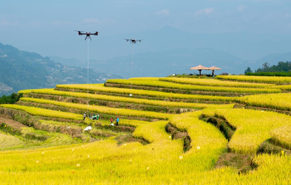 10月10日,湖北省秭歸縣沙鎮(zhèn)溪鎮(zhèn)長春村村民用無人機轉運收獲的水稻(無人機照片)。新華社發(fā)(雷勇攝)