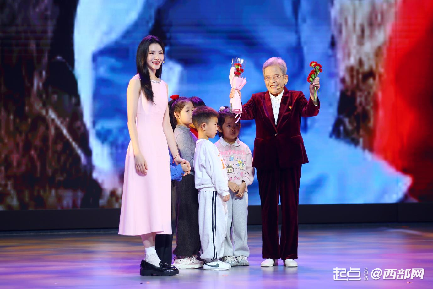 啟動(dòng)儀式現(xiàn)場(chǎng),演員劉浩存牽著小朋友們?yōu)槁飞匪蜕硝r花。