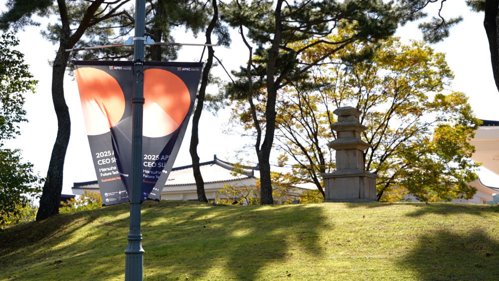 時(shí)值亞太經(jīng)合組織第三十二次領(lǐng)導(dǎo)人非正式會(huì)議,印有APEC標(biāo)識(shí)的條幅在慶州隨處可見。