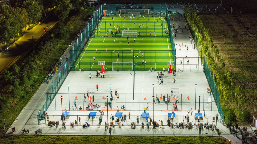 2024年9月21日,居民在山東省寧陽(yáng)縣城區(qū)一處體育公園內(nèi)運(yùn)動(dòng)(無(wú)人機(jī)照片)。近年來,寧陽(yáng)縣充分利用城市空閑區(qū)域,新建或改建體育健身公園,為居民打造“10分鐘體育健身圈”,讓城市的“金角銀邊”成為全民健身大舞臺(tái)。
