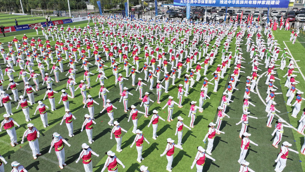 2025年6月10日,群眾在寧夏銀川市金鳳區(qū)覽山公園參加千人健身操展演(無(wú)人機(jī)照片)。當(dāng)日,紀(jì)念“發(fā)展體育運(yùn)動(dòng) 增強(qiáng)人民體質(zhì)”題詞73周年全民健身主題活動(dòng)在覽山公園舉行