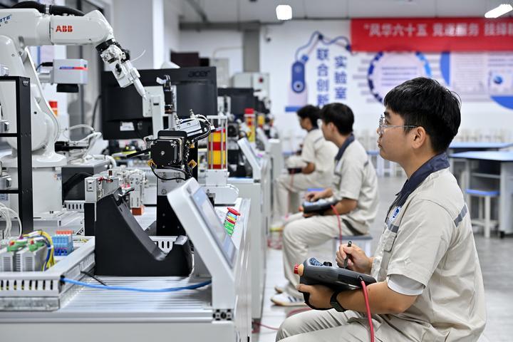 2024年7月26日,湖南鐵道職業(yè)技術(shù)學(xué)院的學(xué)生在工業(yè)機器人基礎(chǔ)應(yīng)用實訓(xùn)室接受工業(yè)機器人操控技能訓(xùn)練。教育部發(fā)布的數(shù)據(jù)顯示,近年來,現(xiàn)代制造業(yè)、戰(zhàn)略性新興產(chǎn)業(yè)和現(xiàn)代服務(wù)業(yè)70%以上的新增一線從業(yè)人員來自職業(yè)院校。職業(yè)院校已經(jīng)成為培養(yǎng)大國工匠、能工巧匠、高技能人才的主陣地。