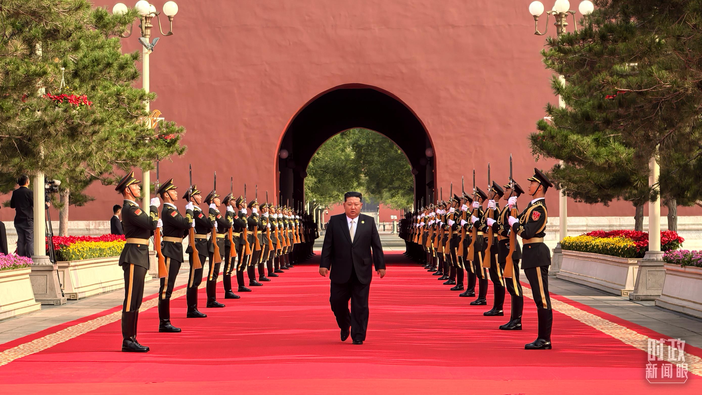 △9月3日上午,金正恩抵達(dá)端門(mén)外廣場(chǎng)參加迎賓儀式。(總臺(tái)央視記者李增仁拍攝)