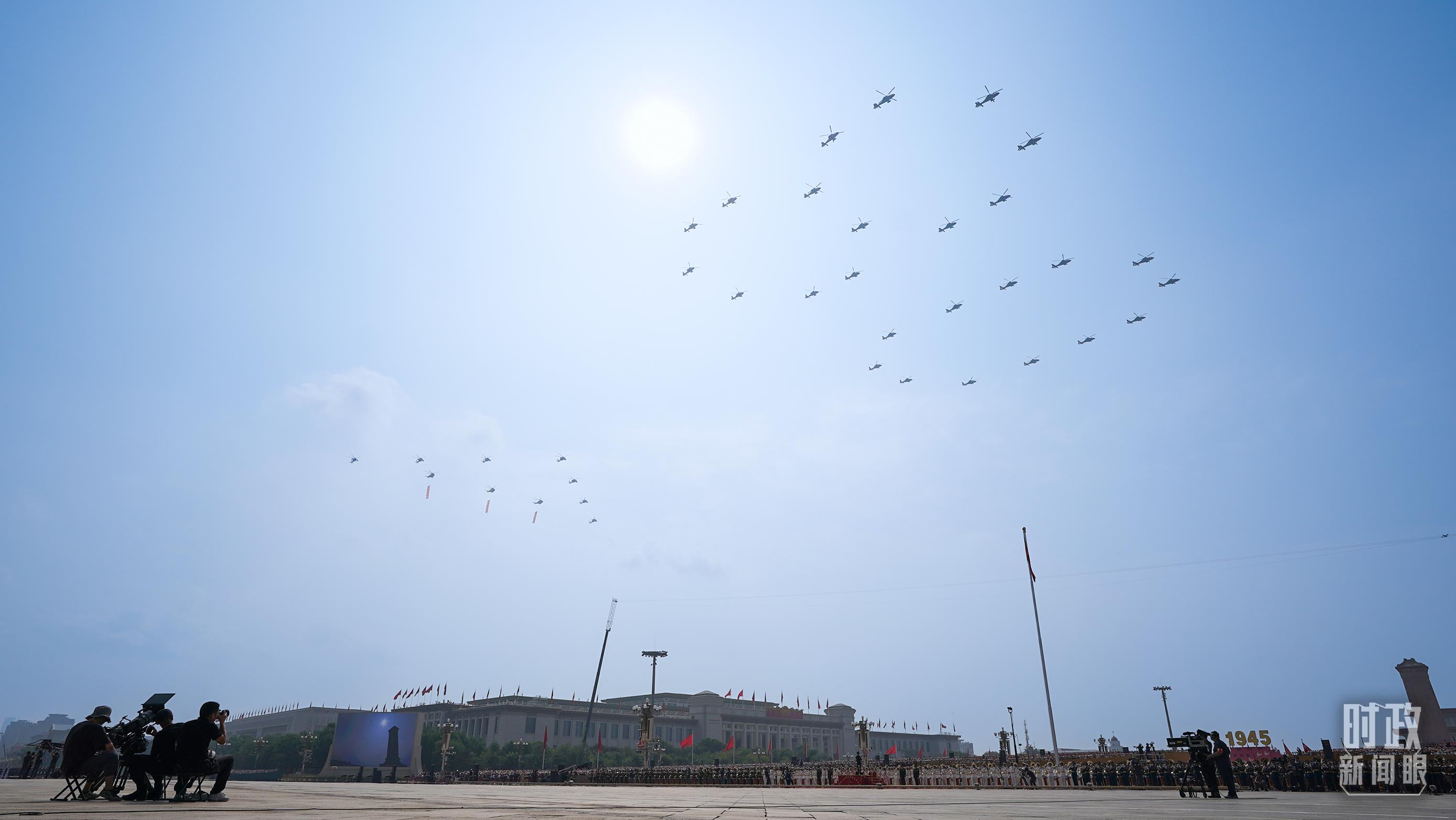 △9月3日,3架直升機(jī)分別懸掛“正義必勝”“和平必勝”“人民必勝”條幅飛過(guò)天安門(mén)廣場(chǎng)。(總臺(tái)記者李晉拍攝)