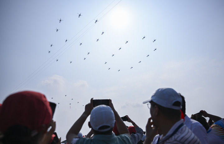 9月3日,習(xí)近平總書記同來自五大洲的外國(guó)友人并肩站立在天安門城樓上。26架直升機(jī)組成巨大的“80”字樣飛過,眾人仰首凝望。