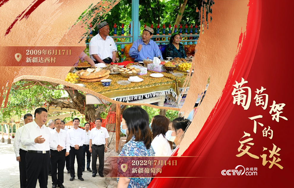 這段對(duì)話,發(fā)生于2022年7月14日。那天下午,習(xí)近平總書(shū)記來(lái)到新疆吐魯番的葡萄溝,與來(lái)自天南海北的游客親切交談。