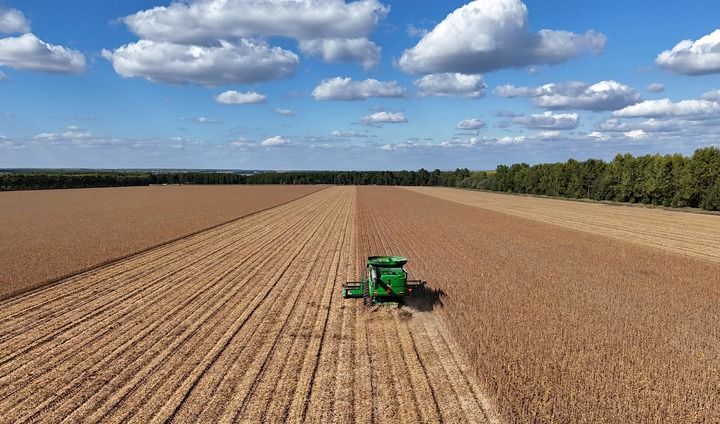 2025年9月19日,在北大荒集團(tuán)黑龍江格球山農(nóng)場(chǎng)有限公司大豆地塊,收獲機(jī)車在進(jìn)行收獲作業(yè)(無人機(jī)照片)。新華社發(fā)(陸文祥攝)