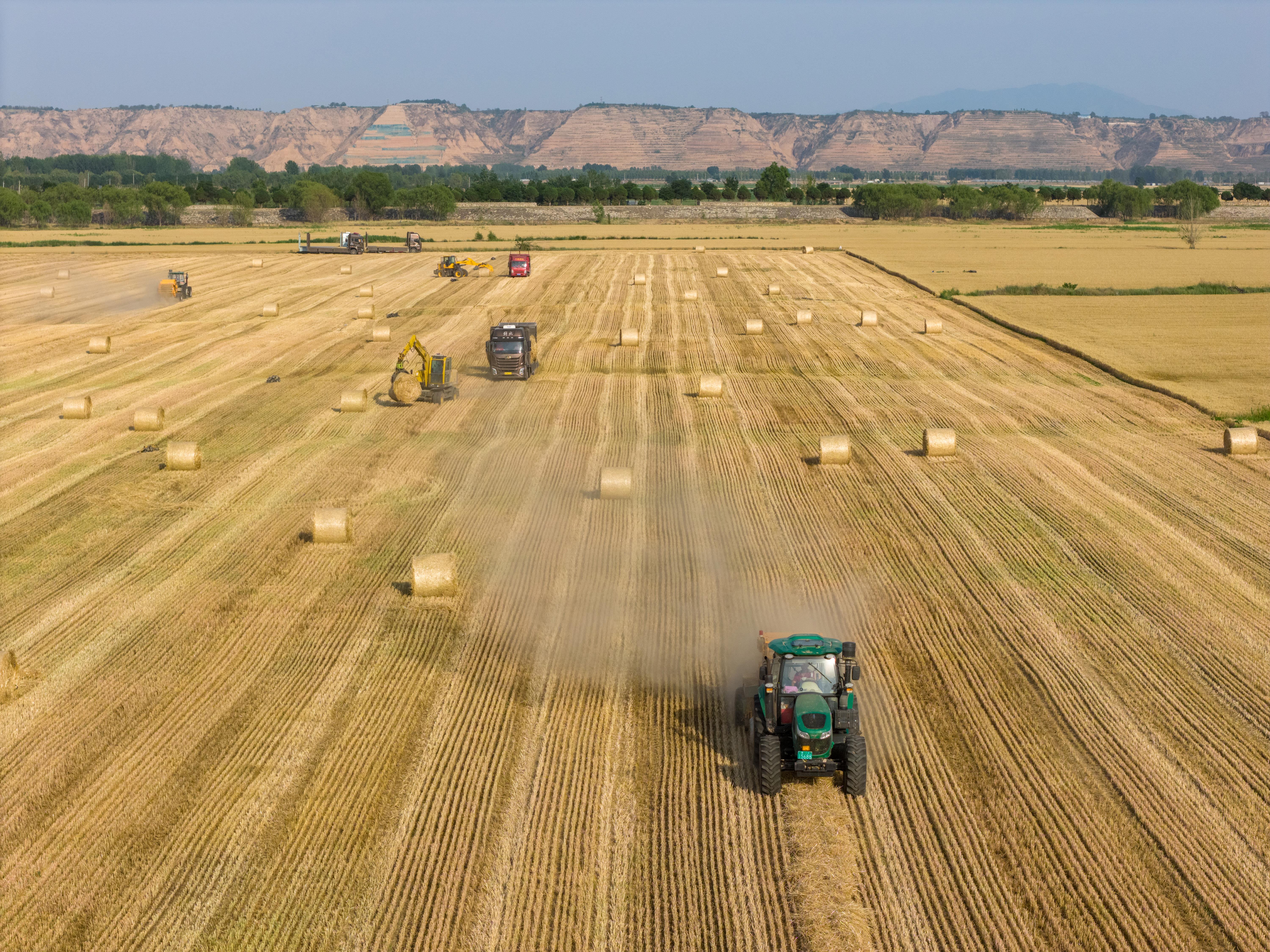 △據(jù)國(guó)家統(tǒng)計(jì)局發(fā)布的數(shù)據(jù),2025年全國(guó)夏糧總產(chǎn)量14973.8萬(wàn)噸,實(shí)現(xiàn)穩(wěn)產(chǎn)豐收。圖為今年6月,山西運(yùn)城裴莊鎮(zhèn)黃河灘涂上,農(nóng)機(jī)手忙著實(shí)施小麥秸稈打捆和裝車(chē)運(yùn)輸作業(yè)。