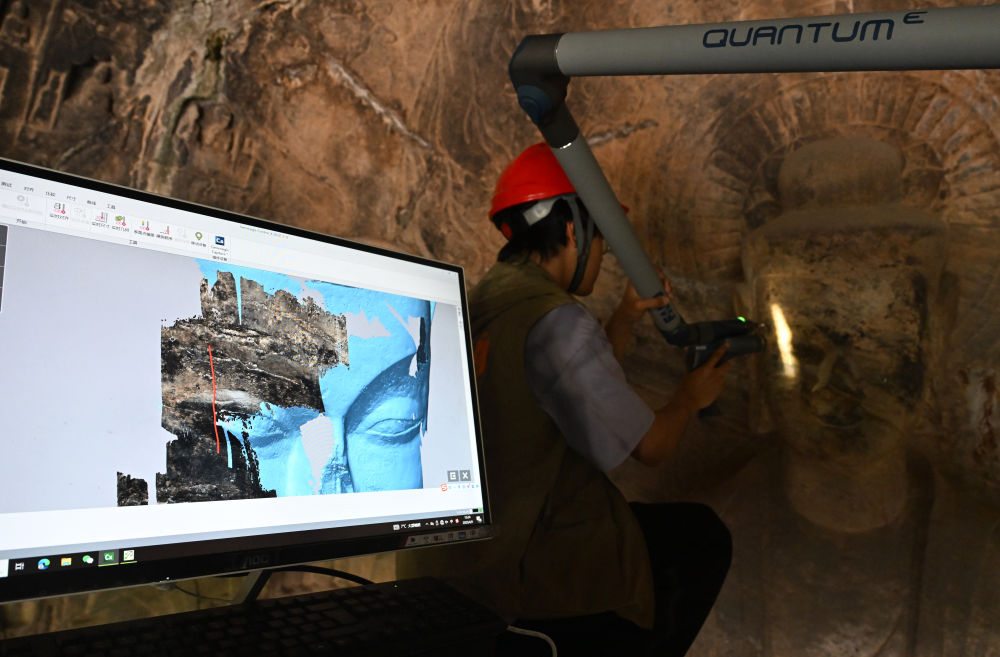 2025年4月9日,武漢大學(xué)文化遺產(chǎn)智能計算實驗室團(tuán)隊成員在河南洛陽龍門石窟魏字洞使用關(guān)節(jié)臂掃描儀對佛像進(jìn)行數(shù)字化掃描。從2005年起,龍門石窟研究院開始為龍門石窟建立數(shù)字化檔案,借助激光掃描、高清攝影等技術(shù)手段收集文物數(shù)據(jù),以數(shù)字的形式留存千年石刻群的風(fēng)貌,致力于讓這一規(guī)模宏大、氣勢磅礴的石窟瑰寶“芳華永駐”。