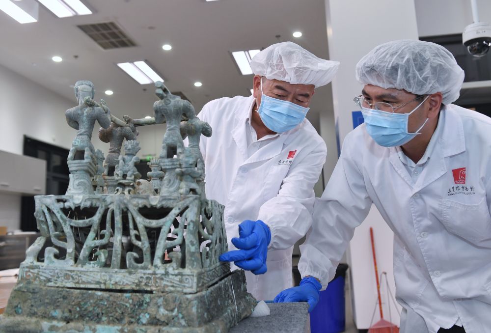 2023年5月30日,在四川三星堆博物館文物保護(hù)和修復(fù)中心,文物修復(fù)師郭漢中(左)與同事討論神壇底座修復(fù)方案。郭漢中從事文物修復(fù)工作已40余年,深度參與了三星堆祭祀坑的發(fā)掘工作,累計修復(fù)文物6000余件?!按蟾胚€有上萬件文物等著修復(fù),需要一代接著一代往下干?!惫鶟h中說,他要把平生所學(xué)傳承下去,培養(yǎng)更多人才。
