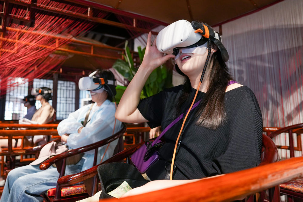 2025年5月18日,游客在江蘇蘇州拙政園體驗VR漫游。近年來,蘇州不斷推進(jìn)“數(shù)字園林”建設(shè),在園林整體數(shù)字建模、園林要素數(shù)據(jù)庫建設(shè)等方面開展探索,利用數(shù)字技術(shù)創(chuàng)造“數(shù)字云游”VR場景,打造“云游拙政園”“獅林園宇宙”“留園虛擬元宇宙”等項目,營造真實可感的虛擬空間,讓觀眾沉浸式感受蘇州園林的獨特魅力。