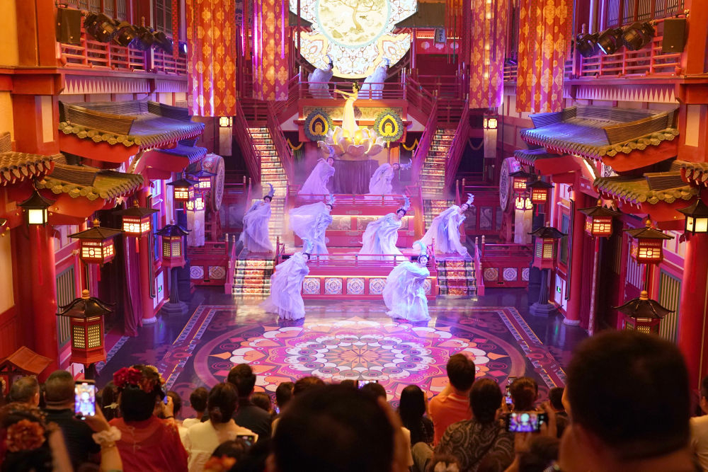 2024年5月19日,游客在西安長安十二時辰景區(qū)觀看表演《霓裳羽衣舞》。“長安十二時辰”主題街區(qū)將唐朝文化與現(xiàn)代旅游相結合,讓游客仿佛置身于千年前的長安城。近年來,西安積極推進產(chǎn)業(yè)升級和文旅融合,以中華優(yōu)秀傳統(tǒng)文化創(chuàng)新創(chuàng)造活力助推經(jīng)濟社會高質量發(fā)展,如大唐不夜城一樣火爆“出圈”的文旅項目層出不窮。