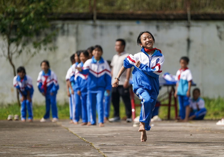 2025年9月15日,云南省普洱市孟連傣族拉祜族佤族自治縣臘福小學學生課間在操場進行奔跑接力比賽。新華社記者 陳欣波 攝