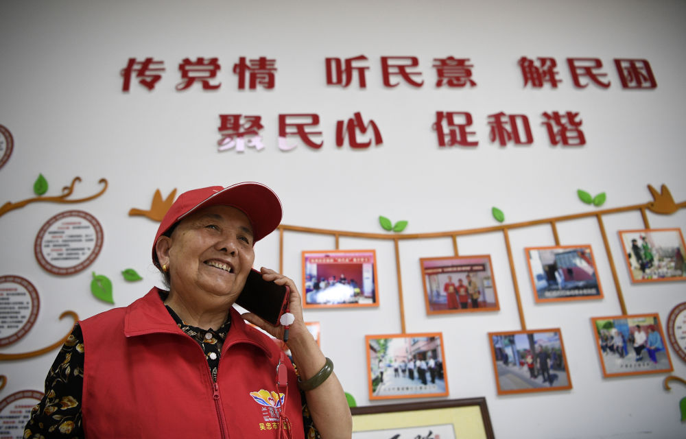 2019年11月29日,在浙江省湖州市織里鎮(zhèn)社會治理綜合服務中心調解室,“平安大姐”工作室的志愿者調解糾紛?!捌桨泊蠼恪眻F隊運用中華優(yōu)秀傳統(tǒng)文化中的“調解”思維,依靠親情、友情、鄉(xiāng)情“說和調?!保{解糾紛,化解矛盾。