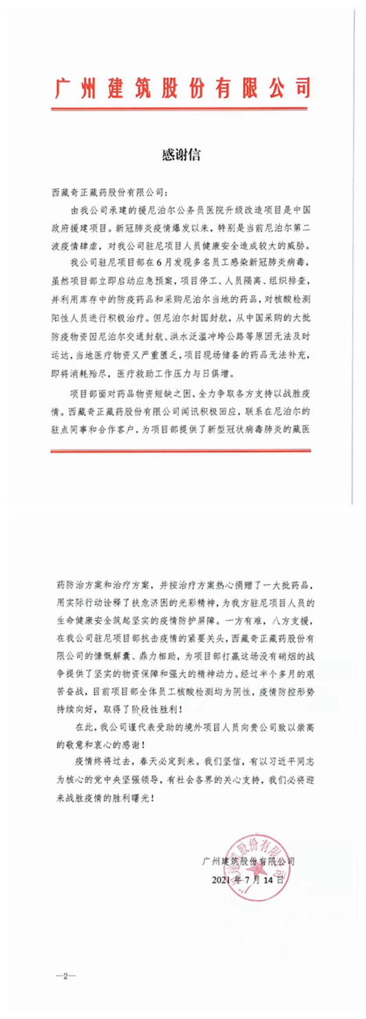 患者經(jīng)多次核酸檢測轉(zhuǎn)陰未復陽后,廣州建筑集團特地給西藏奇正藏藥股份有限公司寫了一份感謝信,信中寫到:西藏奇正藏藥股份有限公司為項目部提供了新型冠狀病毒肺炎的藏醫(yī)藥防治方案和治療方案,并按治療方案熱心捐贈了一大批藥品,用實際行動詮釋了扶危濟困的光彩精神,為我方駐尼項目人員的生命健康安全筑起堅實的疫情防護屏障。一方有難,八方支援,在我公司駐尼項目部抗擊疫情的緊要關頭,西藏奇正藏藥股份有限公司的慷慨解囊、鼎力相助,為項目部打贏這場沒有硝煙的戰(zhàn)爭提供了堅實的物資保障和強大的精神動力。