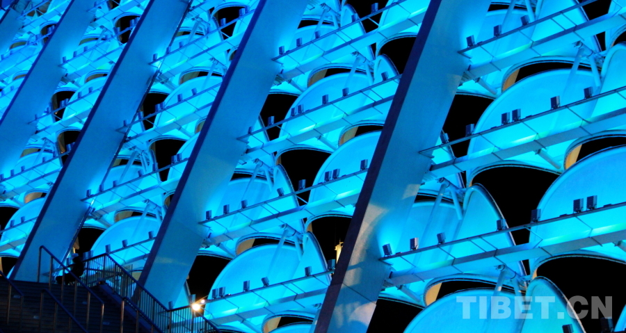 圖為三亞市體育中心體育場(chǎng)內(nèi)部的玻璃結(jié)構(gòu)反射的藍(lán)色燈光 攝影:劉莉