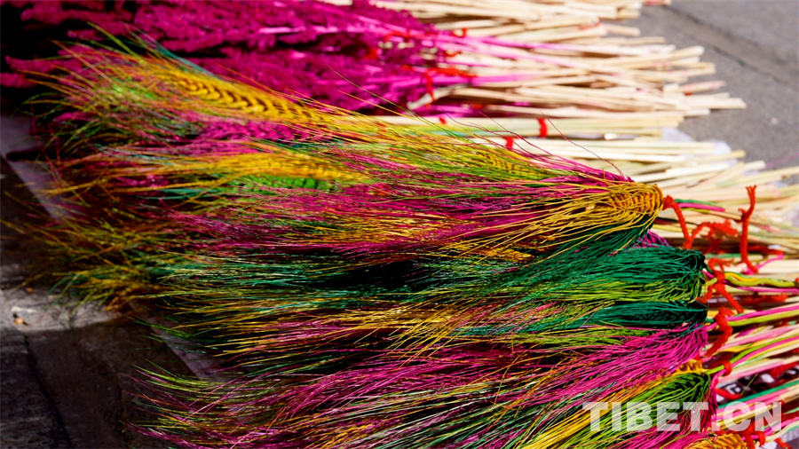 在藏歷新年年貨物品中,提及酥油花就不得不提它的“搭檔”“羅薩梅朵”,正是因為它們的裝點讓藏歷新年中本身就已很精致的“切瑪盒”更加亮眼。“羅薩梅朵”被稱為“冬季里最美麗的花”,是經過染色的麥穗和青稞穗制作成的“花卉”。在藏歷新年或節(jié)日之時,人們將其插在盛滿糌粑和青稞的“切瑪盒”上,寓意新的一年美滿、豐收。