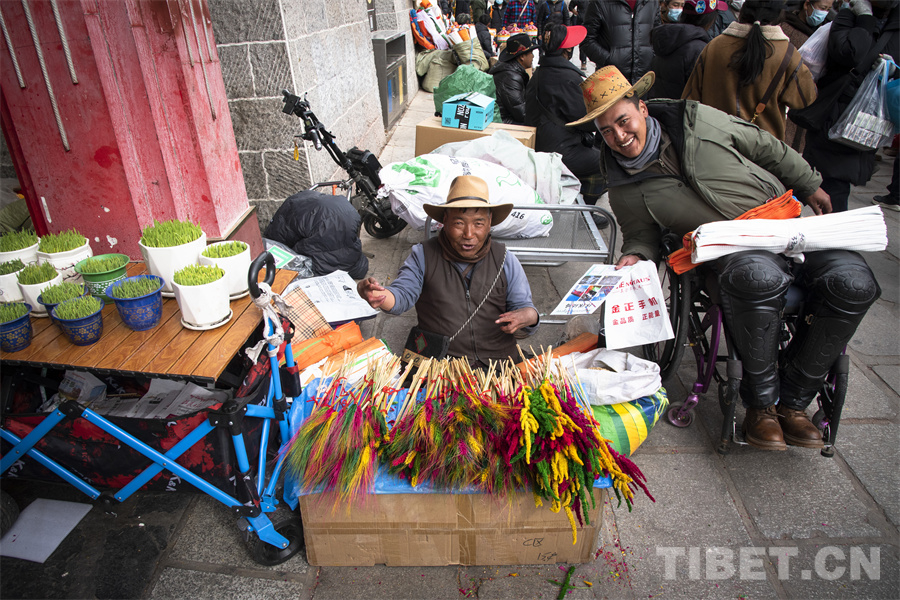 普瓊,來自日喀則市江孜縣,在八廓商城南門前經營著自己的“羅薩梅朵”小攤。初見普瓊,我們被他沖著鏡頭的燦爛笑容所吸引。細細觀察,普瓊坐在地上的身高卻比別人矮了一大截?!拔覀儚睦_堆龍德慶的批發(fā)市場上買來這批‘羅薩梅朵’在此銷售,就希望能夠在年前的這段時間多賺些小錢補貼家用,所有人都想在新年之時過個充裕的‘好年’,不是嗎?”普瓊因一次意外高位截癱,失去雙腿的他并沒有消沉。他選擇積極面對生活,用自己的雙手和命運抗爭,用堅強和勤勞讓自己和全家過上更好的生活。與普瓊不幸的經歷相比,我們每個人過的每個年何嘗不都是一個個“好年”呢?普瓊對生活的那種熱愛,對明天會更好的堅定,何嘗不是我們對每一個“好年”所孜孜追求的呢?