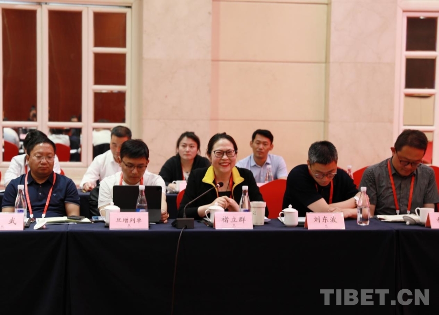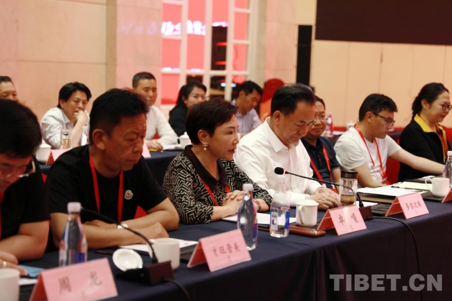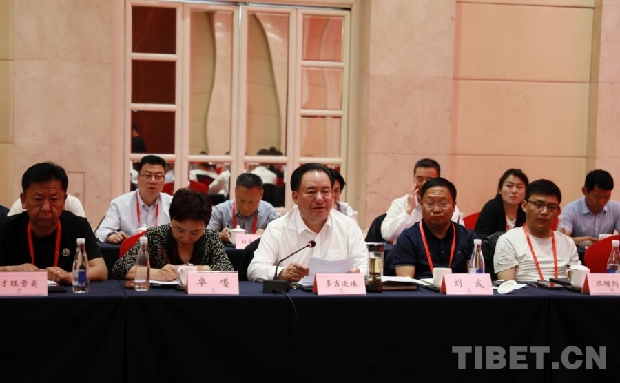 圖為西藏自治區(qū)政協(xié)黨組成員、副主席、區(qū)工商聯(lián)主席、總商會(huì)會(huì)長(zhǎng)多吉次珠(前排左三)發(fā)言 攝影:劉莉