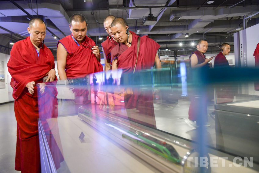 圖為西藏佛學院師生在高原“綠巨人”復興號動車組模型前駐足 攝影:趙振宇