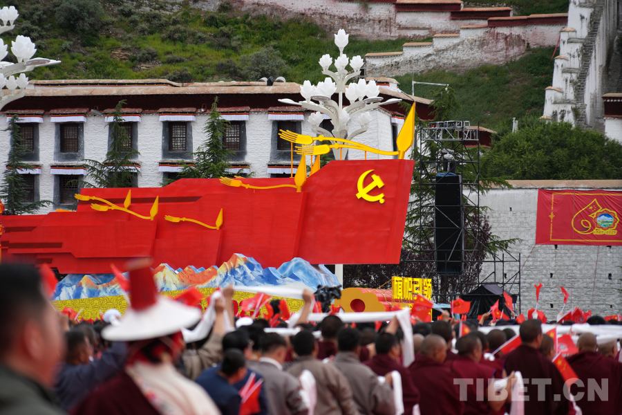 中國西藏網(wǎng)訊 西藏自治區(qū)成立60周年慶祝大會于8月21日上午10時(shí)在拉薩隆重舉行。伴隨著歡快的音樂,熱烈歡騰的群眾游行在“旗幟引領(lǐng)”彩車的帶領(lǐng)下正式開始。(中國西藏網(wǎng) 記者/王淑  馮重霖 劉莉 趙釗 姚浩然 楊眉笑 德吉卓瑪 趙振宇 賈華加 邊子捷 次旦拉姆 旦曲)