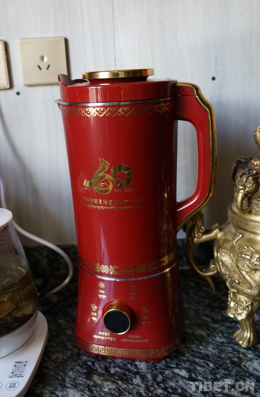 走進客廳,茶幾上擺放著一臺紅色嶄新的全自動酥油茶壺,機身上鐫刻著“慶祝西藏自治區(qū)成立60周年”的字樣。另一旁的展柜上,一套鎏金茶碗嶄新如初,仿佛能映出人影——那是2015年中央代表團贈送的西藏自治區(qū)成立50周年禮物。這些細節(jié),無不透露出主人對它的珍視。