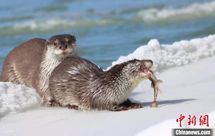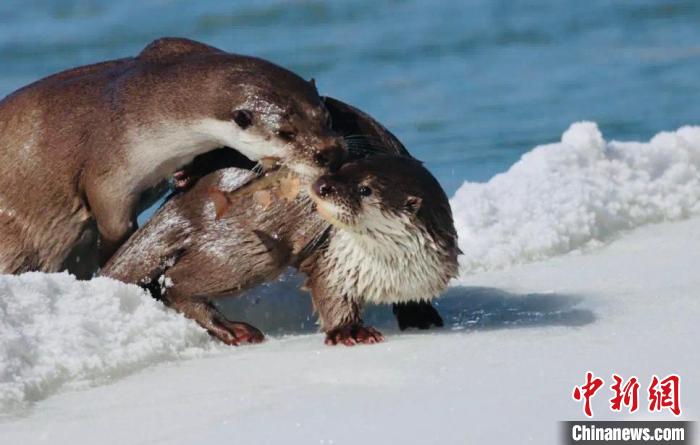 圖為鳥類調(diào)查期間,偶遇水獺母子在河邊捕魚。青海多美生態(tài)環(huán)保科技有限公司 供圖
